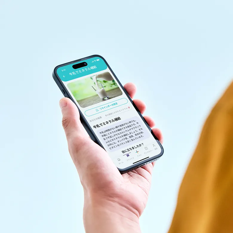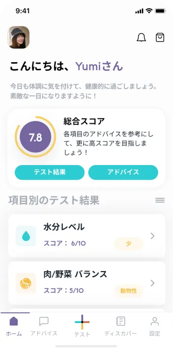 管理栄養士が監修したアドバイスを、テスト結果や飲酒や喫煙、食品アレルギーなどのユーザー登録情報に合わせてお届けします。不足している栄養素を補うための提案や作ってみたくなる簡単レシピをご紹介します。