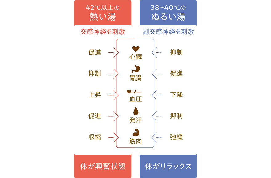 ぬるめの湯は刺激が少なくリラックス、42℃以上の熱いお湯は刺激が強く体を興奮状態に導きます。温度の使い分けに、注意しましょう。