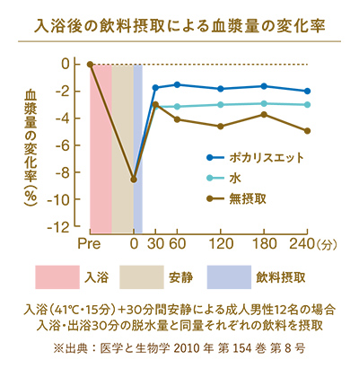 ある研究では、入浴により約800mlもの水分とイオンが失われました(下図)。そのため、入浴前後にも水分補給が大切。研究結果によると、真水よりもナトリウム、カリウムなどが含まれたイオン飲料が吸収が早いことがわかりました。