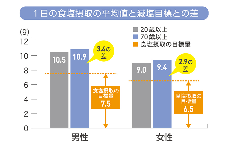 令和4年「国民健康・栄養調査」(厚生労働省)によると、20歳以上の食塩摂取量の平均値は男性が10.4g、女性は9.0g。その中でも、70歳以上は男性10.9g、女性は9.4gというように高齢になるほど食塩摂取量は高めとなっています。