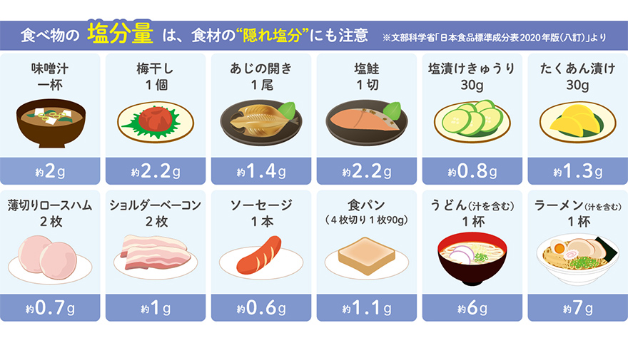 例えば、前述の「国民健康・栄養調査」で高齢者の食塩摂取量が高めなのは、味噌汁、焼き魚、漬物といった、いわゆる和食の定番をよく食べていることも理由の一つ。食塩摂取量は単純に塩だけではなく、調味料に含まれる塩分や食材そのものに含まれる“隠れ塩分”が盲点になることがあるからです。