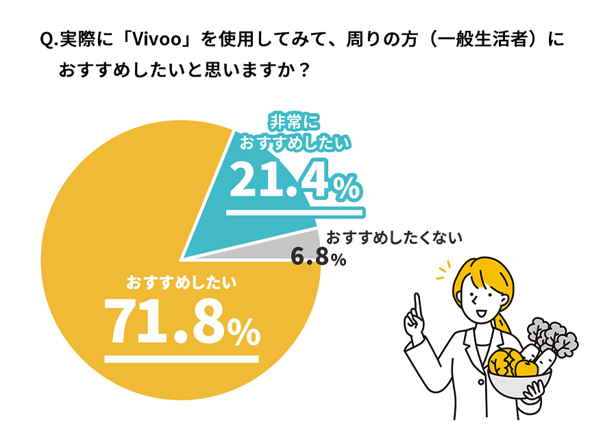 こうした特長から、「Vivoo」は生活習慣の改善や食事管理の動機づけ、実行サポートに役立つツールとしての活用が期待できます。