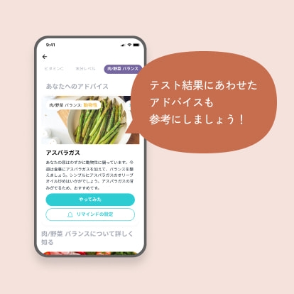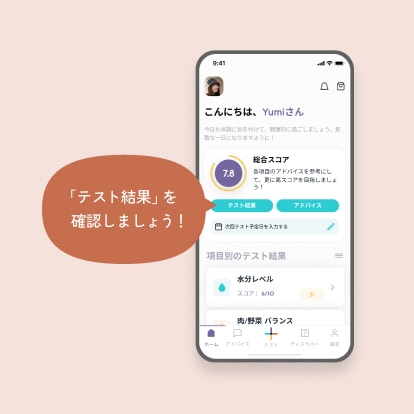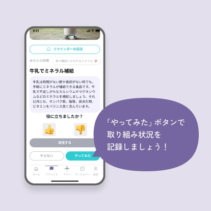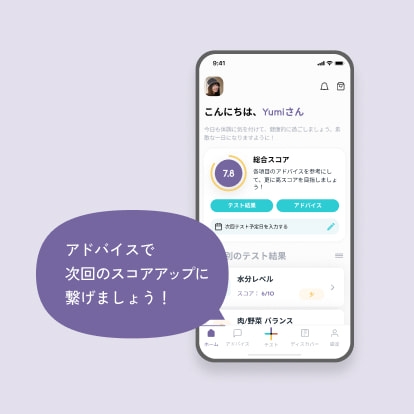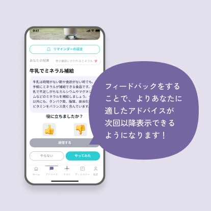 テスト結果やユーザー登録情報をもとに、アドバイスが表示されます。提案されたアドバイスにフィードバックをすることでAIが学習し、テストを重ねるごとにあなたに適したアドバイスをご提案します。