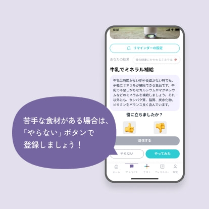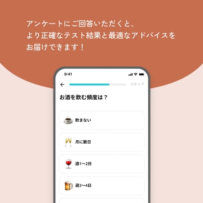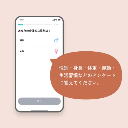 まずはユーザー登録をしましょう!性別・身長・体重・運動や生活習慣などのアンケートに回答いただくことで、あなたに合わせたアドバイスを提供します。
