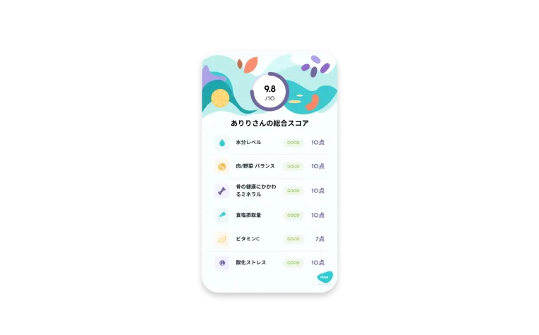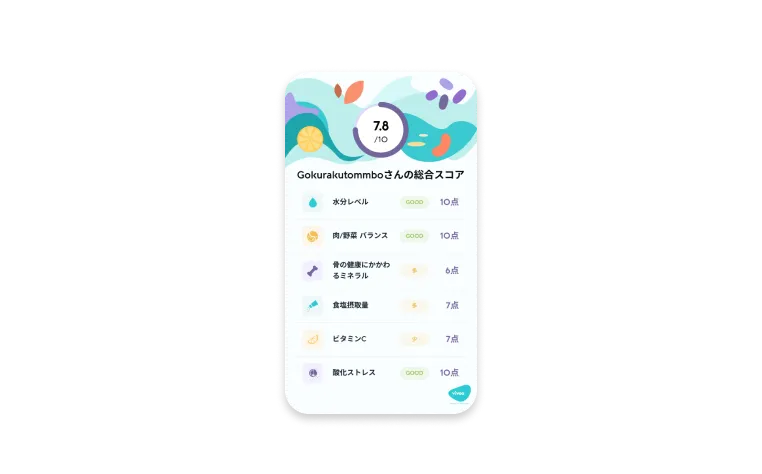 健康診断が年に1回しかないため、日頃の栄養状態などが気になりVivooを使い始めました。結構水分をとっていると思っていましたが、水分スコアが低かったため、いつもの水筒を500mlから750mlに変更したところ、スコアが改善しました。