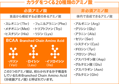 そのうち9種類は、体内では合成できない必須アミノ酸と呼ばれます。 BCAAはこの必須アミノ酸の中で