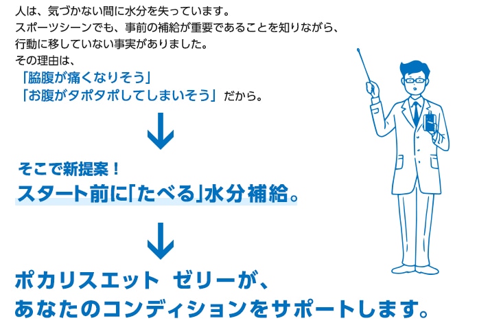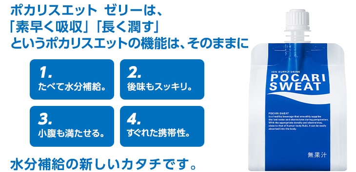 ポカリスエットの電解質組成はそのままに、「たべる」水分補給です。ゼリー形状によるスッキリとした口当たりと甘さ。携帯性に優れ、いつでもどこでも水分補給ができます。