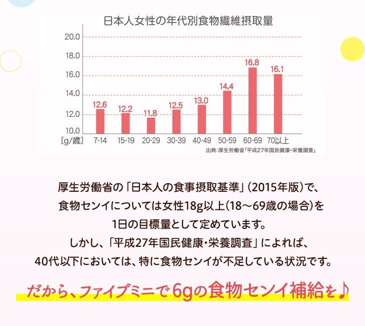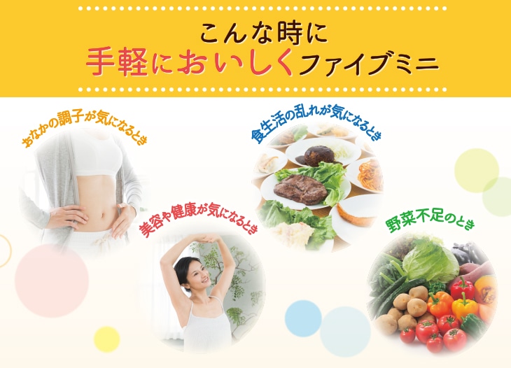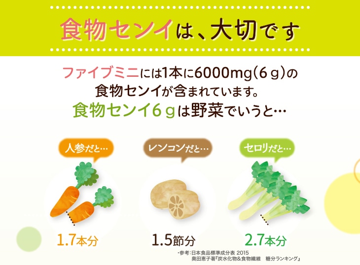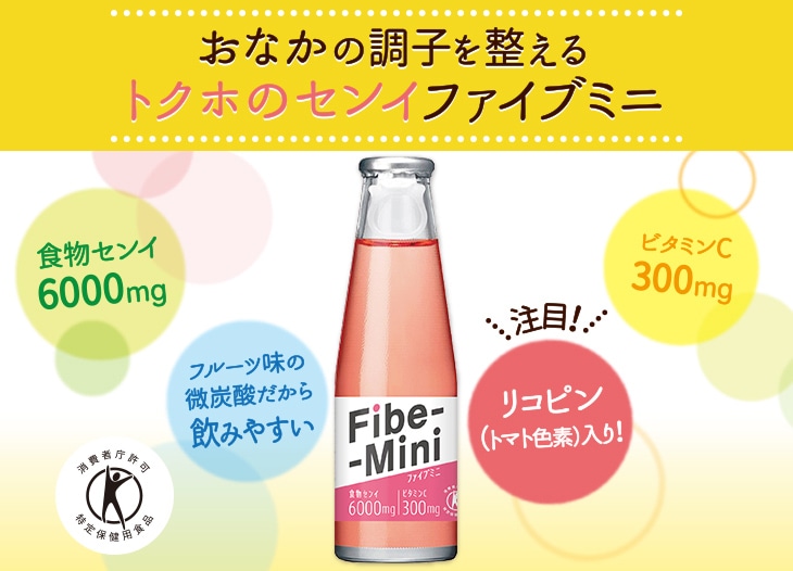 ファイブミニは、食生活で不足しがちな食物繊維を手軽にとり、おなかの調子を整える食物繊維飲料です。