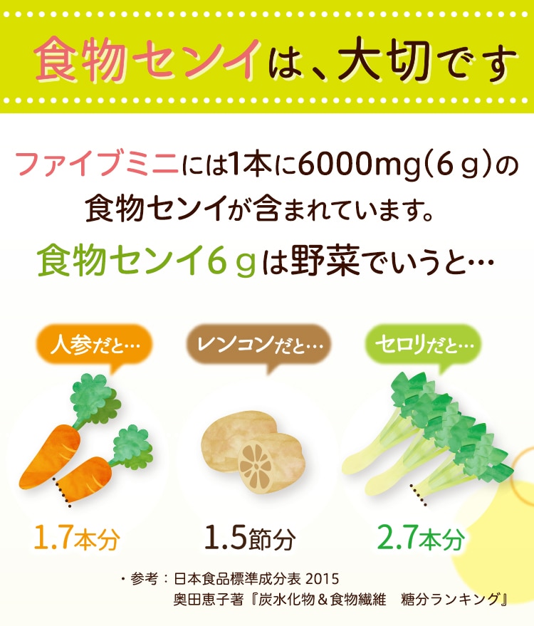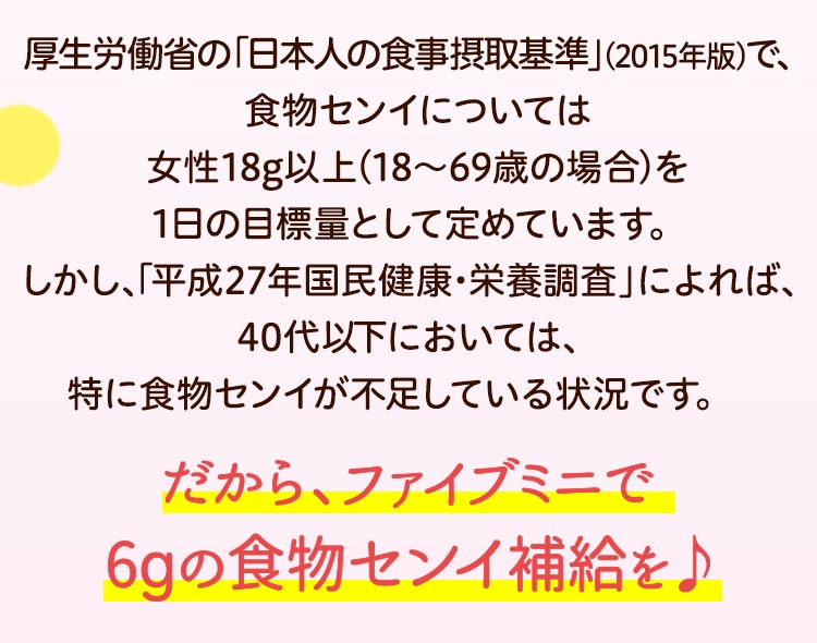 ファイブミニは、食生活で不足しがちな食物繊維を手軽にとり、おなかの調子を整える食物繊維飲料です。