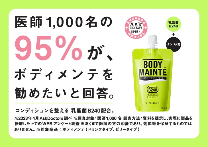 乳酸菌B240は、大塚製薬の長年に渡る腸と乳酸菌に関する研究から、その働きを確認した植物由来の乳酸菌です。この乳酸菌B240をシーンや目的に応じて手軽に摂取し、体調維持をサポートする製品として開発されたのが「ボディメンテ」です。