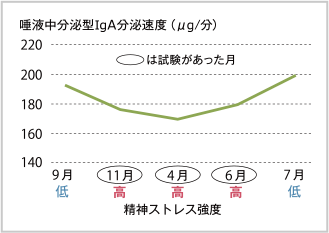 歯学部1年生64人の精神的ストレスと唾液中のIga分泌速度の関係。学期始め(9月)の低ストレス時、試験がある高ストレス時(3回)、ストレスから解放された学期末の計5回測定した結果、高ストレス時のIga分泌速度が低かった。
