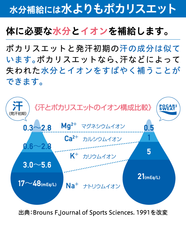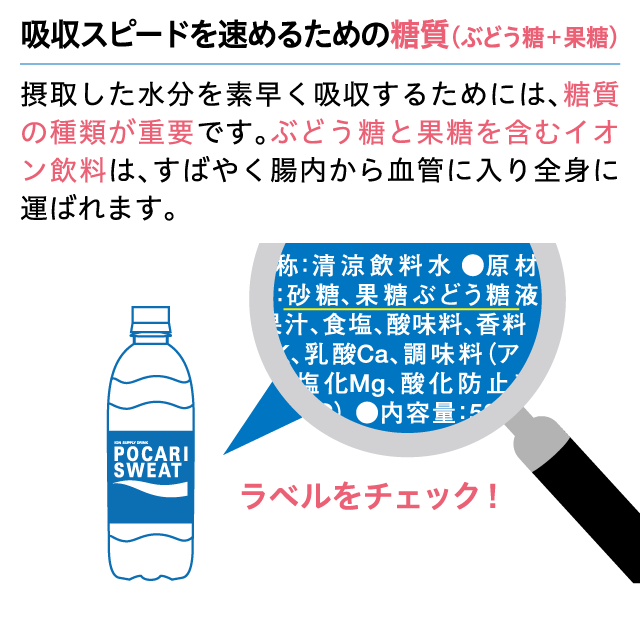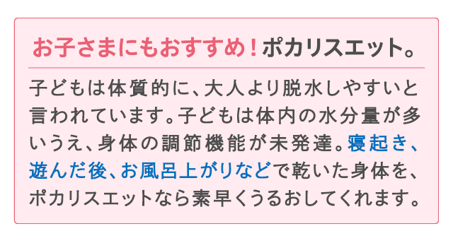 発汗により失われた水分、イオン(電解質)をスムーズに補給する健康飲料です。バッグに入れて便利に持ち運べるミニボトル。