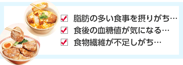 食後の血糖値が気になる方や脂肪の多い食事を摂りがちな方の食生活の改善に役立ちます。