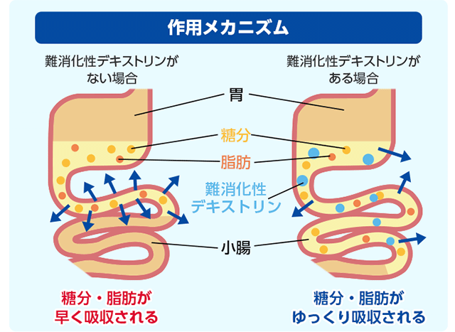 「難消化性デキストリン」を食事とともに飲むことで、小腸からの糖分・脂肪の吸収スピードを緩やかにして、食後の血糖値や血中中性脂肪の上昇をおだやかにします。