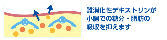 食物繊維「難消化性デキストリン」の働きで、糖分や脂肪の吸収を抑えることにより、食後の血糖値や血中中性脂肪の上昇をおだやかにします。食後の血糖値が気になる方や脂肪の多い食事を摂りがちな方の食生活の改善に役立ちます。