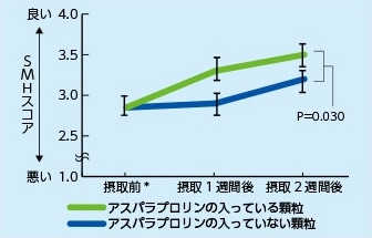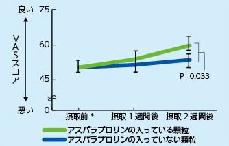 土日が休日の日勤者で、「ミュンヘンクロノタイプ質問紙(MCTQ)」でソーシャル・ジェットラグがあると判定された健康な男女44人(平均37.9歳)が対象。ソーシャル・ジェットラグ時間の平均は95.4分。アスパラプロリン55μgの入っている顆粒か、アスパラプロリンの入っていない顆粒(対照食品)を、1日1回、夕食後から就寝までの間に摂取した場合を比較。月曜の起床時、「セントマリー病院睡眠調査票(SMH)」で自己評価した目覚め、「Visual Analogue Scale(VAS)」で自己評価した睡眠の質は、どちらも摂取開始2週間後に有意に改善した。