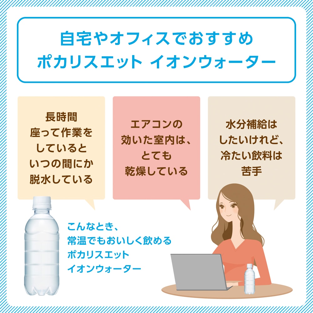 汗をかいていない日常のシーンに適したイオンバランスで作られているため、普段の生活で失われた水分とイオン(電解質)をバランスよく補給し、毎日のコンディションをサポートします。