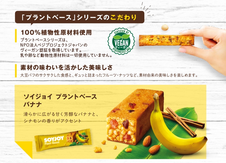100%植物由来の原材料で作られたプラントベースのソイジョイ。滑らかに広がる甘く芳醇なバナナと、シナモンの香りが楽しめます。
