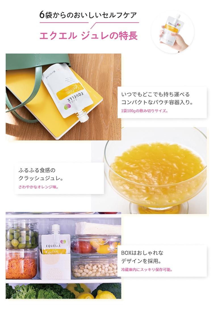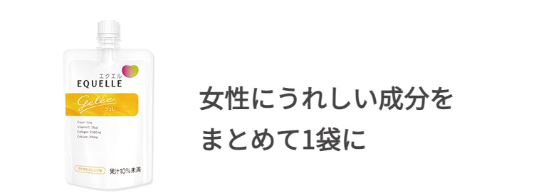 エクオールに加えて、ビタミンD、コラーゲン、カルシウムなど女性にうれしい成分が1袋で摂れるオールインワンのゼリー飲料。さわやかオレンジ味で、おいしく手軽にはじめる大人のスマート習慣におすすめです。