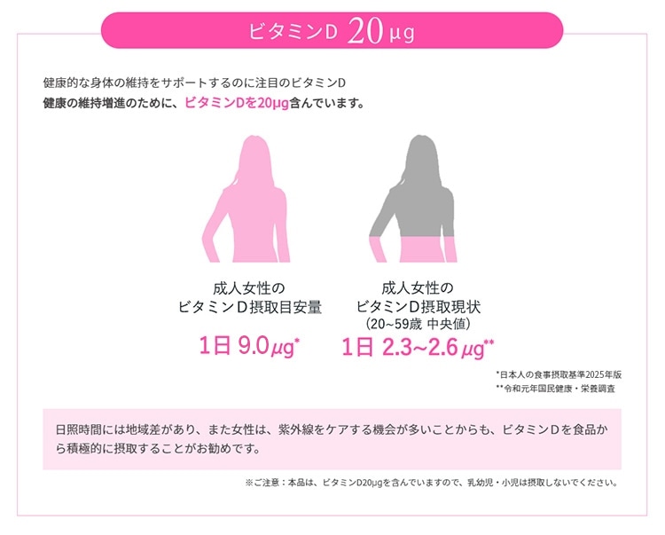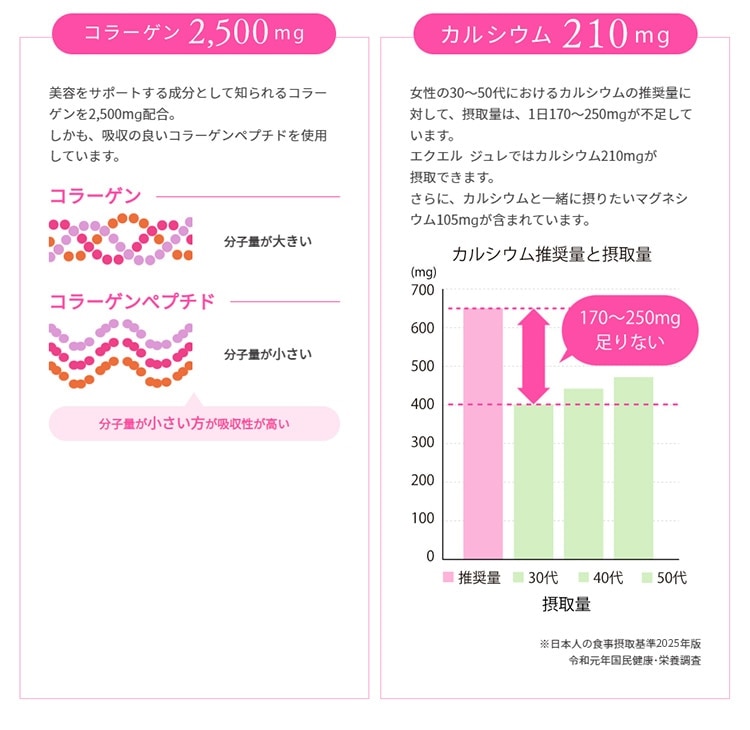 S-エクオール:5mg、大豆イソフラボン(アグリコンとして):3.2mg、コラーゲンペプチド:2,500mg