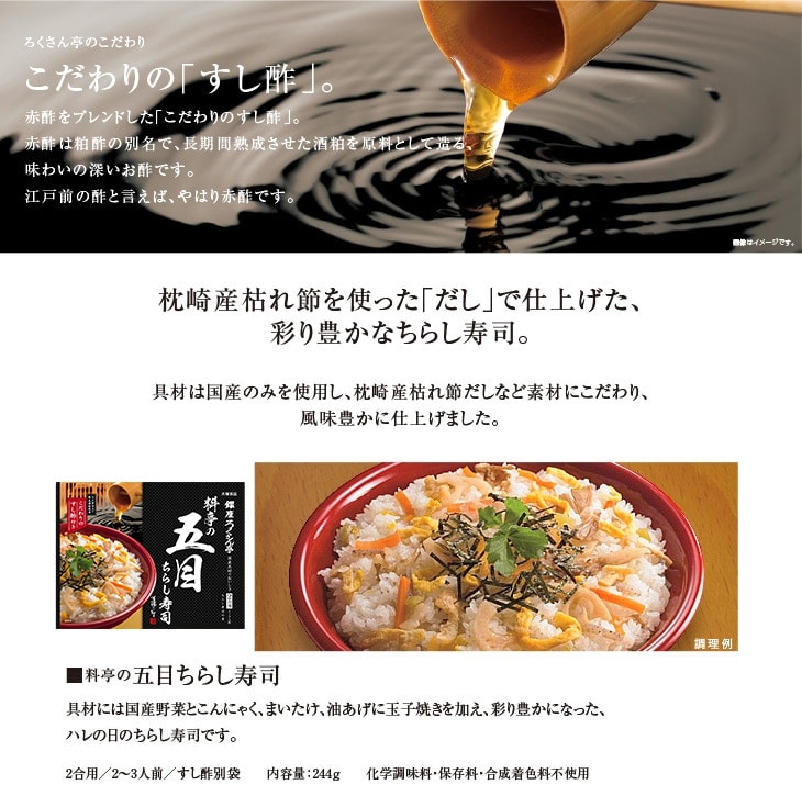 【原材料価格の上昇により、3月3日より価格改定いたしました。】赤酢をブレンドした「こだわりのすし酢」を、具材とは別の袋でご用意しています。具材は国産のみを使用し、枕崎産枯れ節だしなど素材にこだわり風味豊かに仕上げました。化学調味料不使用。2合用で2〜3人前です。