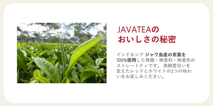 ジャワティからラベルレスボトルが登場。ラベルを剥く手間がないラベルレスでラク&エコな生活をサポートします!ジャワ島産の良質な茶葉を100%使用し、完全発酵させてつくった無添加(香料、着色料不使用)の無糖ストレートティです。