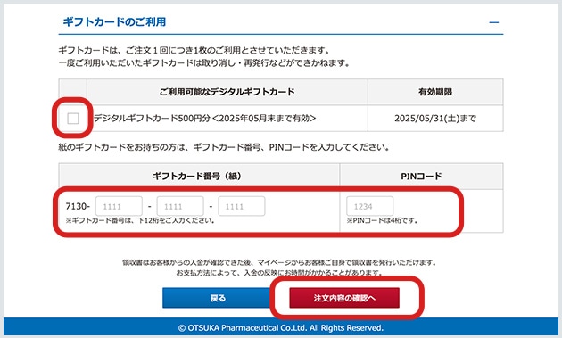 ギフトカード番号、PINコードを入力のうえ、「注文情報の確認へ」ボタンをクリックしてください。※ギフトカードはご注文1回につき1枚のご利用とさせていただきます。