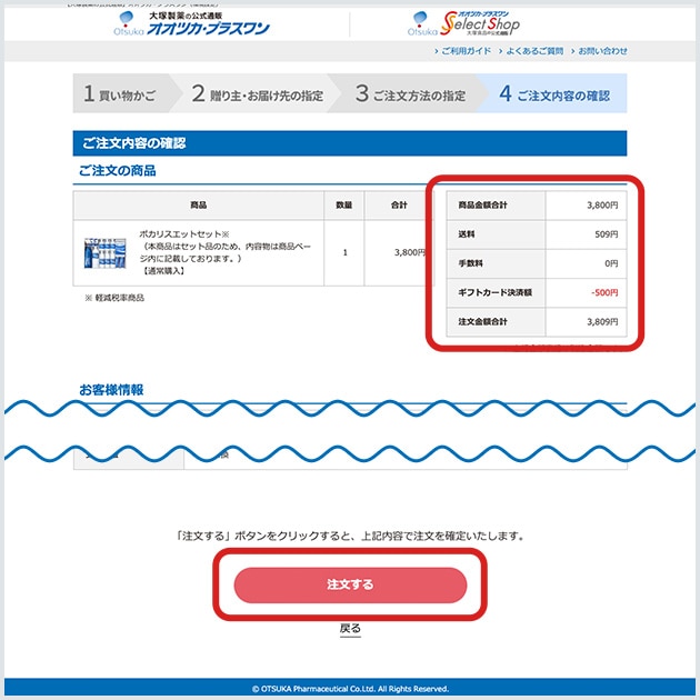 注文金額合計にギフトカードご利用分が適用されているかをご確認ください。