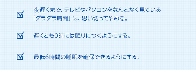 睡眠の時間を確保し、質のいい睡眠をとることが