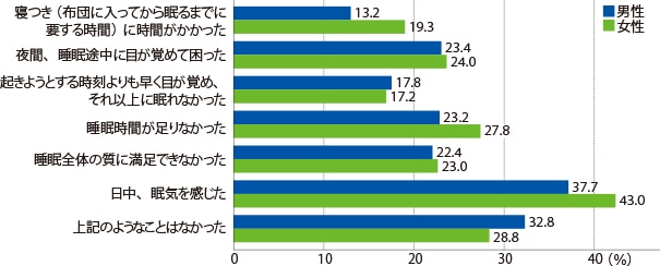 睡眠は、1 日の疲れをとり、心身をメンテナンスするのに欠かせない健康維持の要。しかし、厚生労働省が実施した国民健康・栄養調査では、実に日本人の 5 人に 1 人が、「睡眠の質に満足していない」ことが判明(図 1)。質の悪い睡眠は生活習慣病の罹患リスクを高め、かつ症状を悪化させることもわかっており、睡眠の改善は現代社会において解決すべき大きなテーマになっているのです。