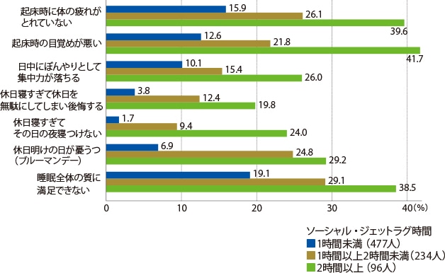 特に、平日と休日の就寝・起床時刻のズレが大きくなると、休日明けだけでなく普通の睡眠にも不調を強く感じる傾向があることが、以下の図表からもわかるかと思います。