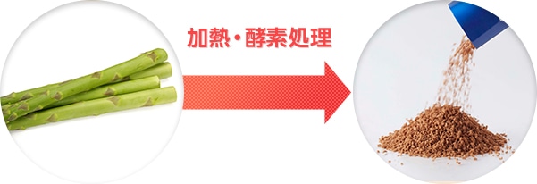 なお、この成分は、アスパラガスを特別な方法(アスパラガスの茎の下位の部分の加熱・酵素処理)で加工することで得られるものであり、アスパラガスをそのまま食べても同様の効果は期待できません。