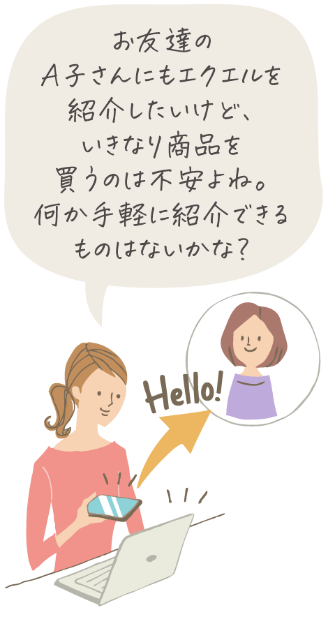エクエルの定期お届け便をご利用いただいている方は、少量のお試しセットをお友達に無料でお届けするサービスもございます。