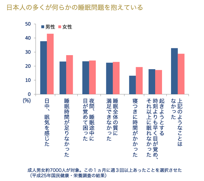 しかし、今、「寝つけない」、「眠りが浅い」などの悩みを訴える人が増えています。年齢とともに「夜中に目が覚める」、「朝早く目が覚めてしまう」などを訴える人、「寝ても疲れが取れない」という悩みを持つ人もいます。5人に1人が睡眠で休養が充分にとれていないと感じるなど、日本人の多くが何らかの睡眠問題を抱えるといわれ、睡眠トラブルは国民全体で解決するべきテーマと考えられています。(平成26年国民健康・栄養調査)