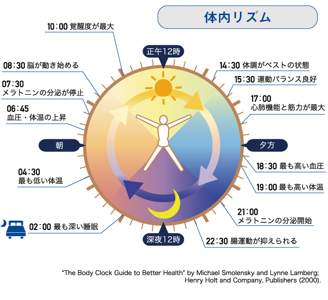 朝は太陽の光とともに目覚めて活動し、夜(午後9〜10時頃)になると脳から睡眠ホルモン・メラトニンが分泌されて眠気がおきて眠る……このように私たちの体には「昼」と「夜」の環境の違いに対応する体内リズムが存在することが分かっています。
