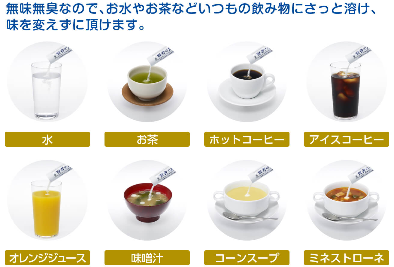 手軽に食物繊維が摂れるように工夫された「賢者の食卓 ダブルサポート」。毎日の食生活に取り入れていただくために、食事の味や食感を変えることなく続けられるよう、無味無臭で粒子の細かい粉末にしました。スティックタイプなので携帯にも便利です。