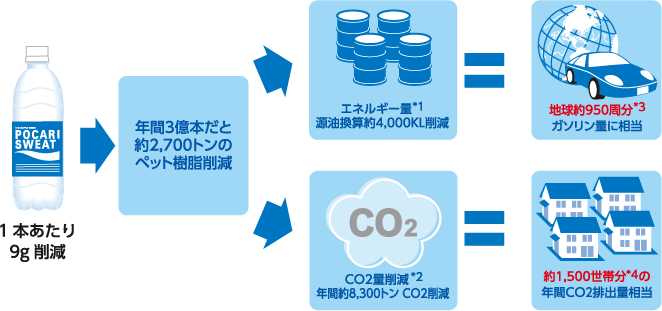 「人々の健康のためにつくったポカリスエットが、地球の健康にも貢献できたらいいのに。」年々、販売本数を伸ばすポカリスエットの人気を歓びながらも、環境負荷の低い商品について考え、ペットボトルの原料になるペット樹脂の使用量を少しでも削減しようと新しいペットボトルの研究開発に取り組みました。しかし、飲料の容器として、強度をキープしながら原料をギリギリまで削減することは簡単ではありませんでした。