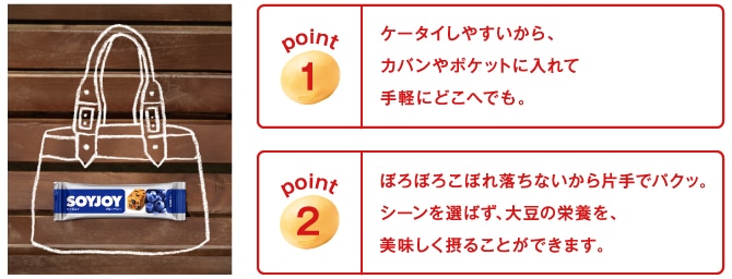 食事の間のつなぎ、ちょっと小腹が空いたときにオススメ。携帯性に優れたSOYJOYは、手軽に持ち運びができます。ぼろぼろこぼれ落ちないのでシーンを選ばず、お召し上がりいただけます。
