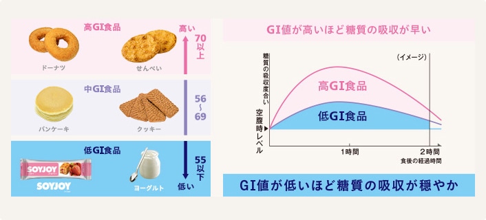 GI(グリセミックインデックス)は食品に含まれる糖質の吸収度合いを示すもので、GI値が低いほど糖質の吸収がおだやかです。