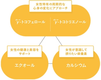 こうして、女性達が抱える月経前の心身の変化をサポートすることはもちろん、将来の健康リスクまでも配慮し、γ-トコフェロール、γ-トコトリエノール、エクオール、カルシウムの4つの成分を配合した複合型サプリメントという仕様が決定しました。
