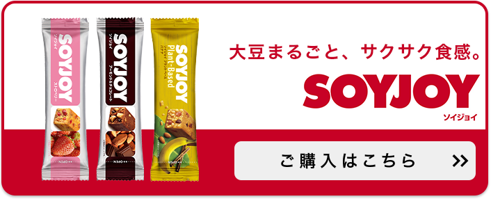 普段の食事だけで植物性食品を補うのが難しい場合は、間食を利用するのもよい方法です。大塚製薬が販売する「ソイジョイ プラントベースシリーズ」も、そんな植物のチカラを活用した食品のひとつ。まるごとの大豆を粉にして焼きあげているので、1本25gで植物性タンパク質6gをはじめ、大豆イソフラボン、食物繊維など大豆の栄養を美味しくスマートに摂ることができます。